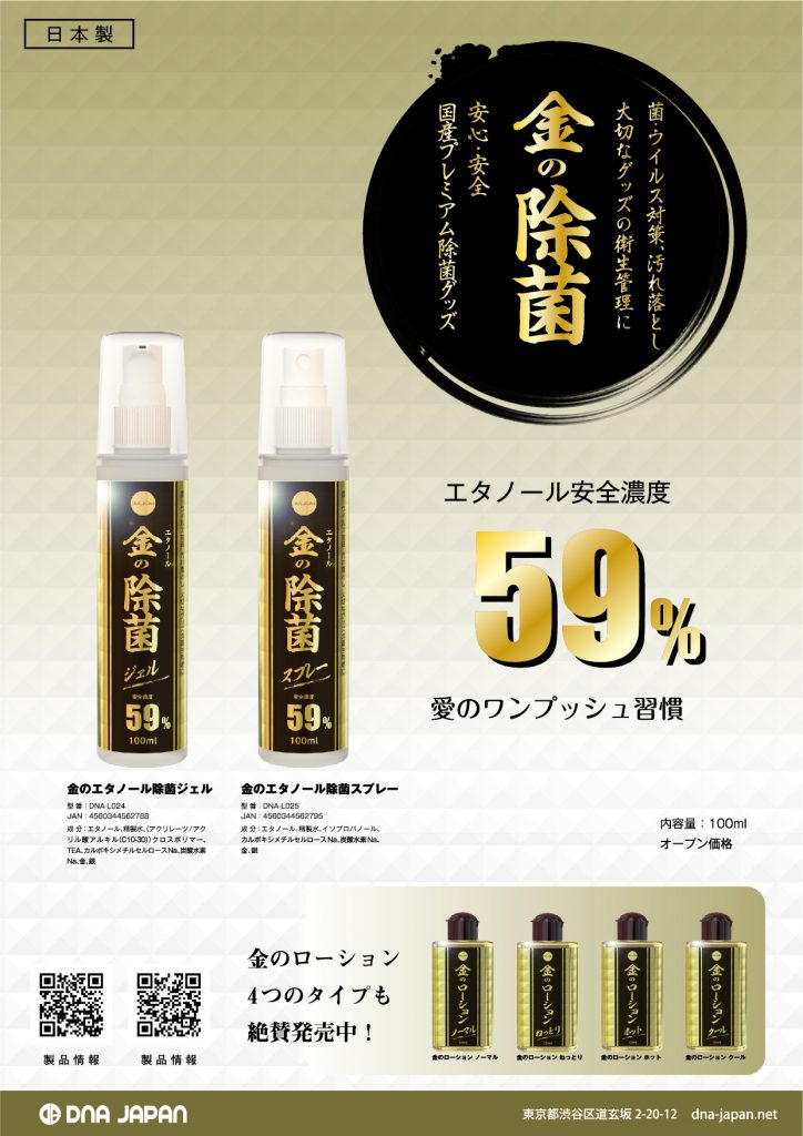 10/14 金のローション4種 金の除菌ジェル&スプレー発売決定! 新製品 Twitter LINE コピー 2020.10.05 ゴールドコロイドを配合した、光輝く至高の高品質ローションと強力エタノール除菌グッズが新登場! ローション4種類と除菌グッズの2種類の発売が決定しました。詳細は商品ページをご確認ください。 商品ページ